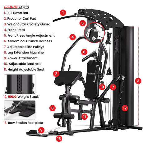 Powertrain Multi Gym 560 90kg Weight Stack 40+ Exercises Leg Press Cable Fly Home Gym